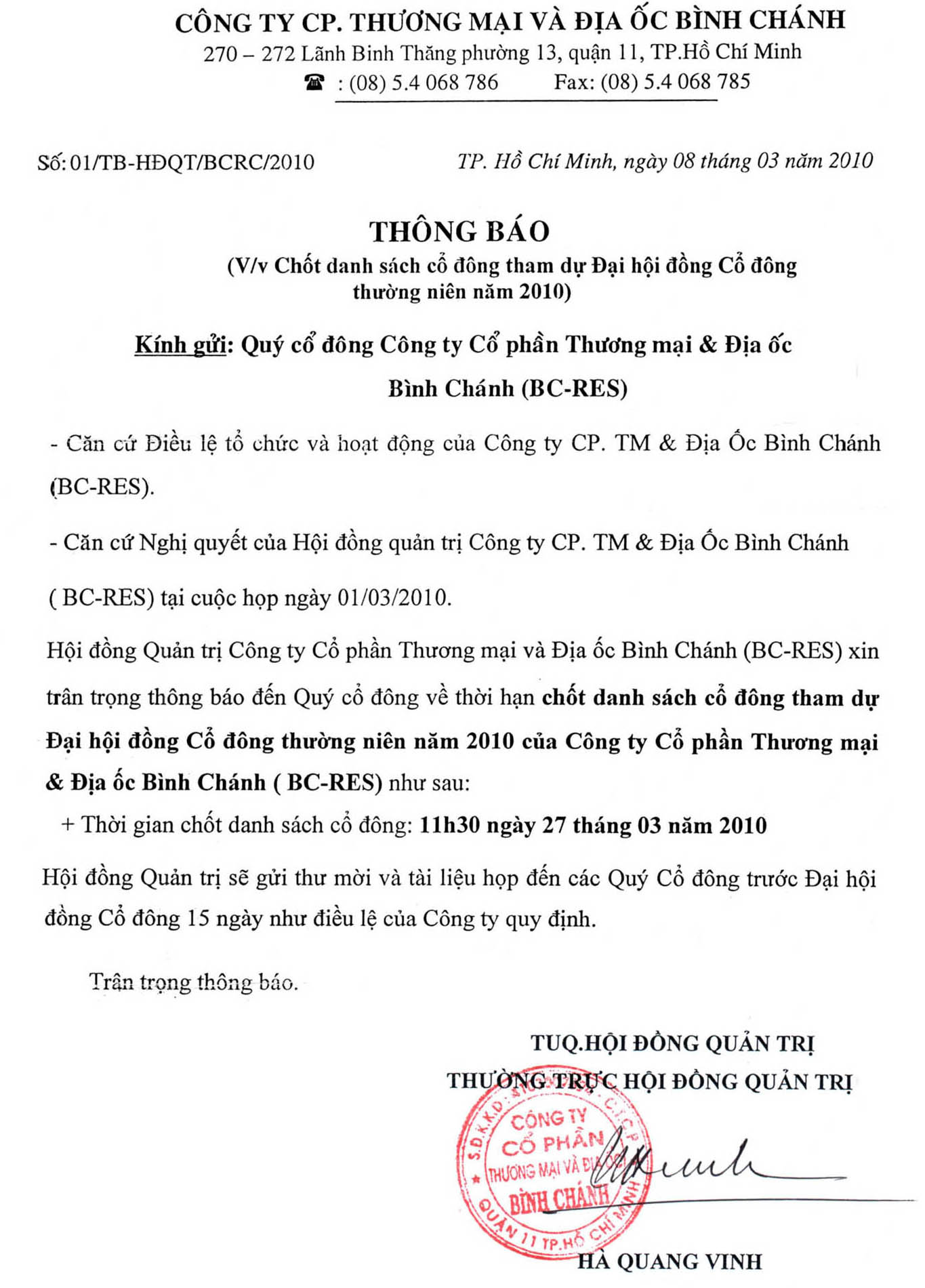 Hội đồng Quản trị Công ty Cổ phần Thương mại và Địa ốc Bình Chánh (BC-RES) xin trân trọng thông báo đến Quý Cổ đông về thời hạn chốt danh sách cổ đông tham dự Đại hội đồng Cổ đông thường niên năm 2010...